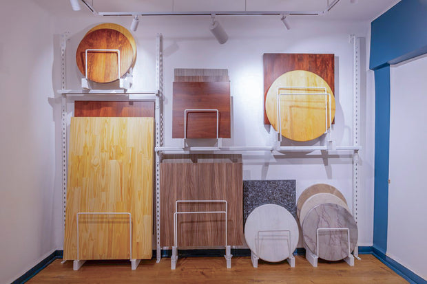 MDF, madera de pino, o parota, con pedestales de acero con pintura electrostática para máxima resistencia.